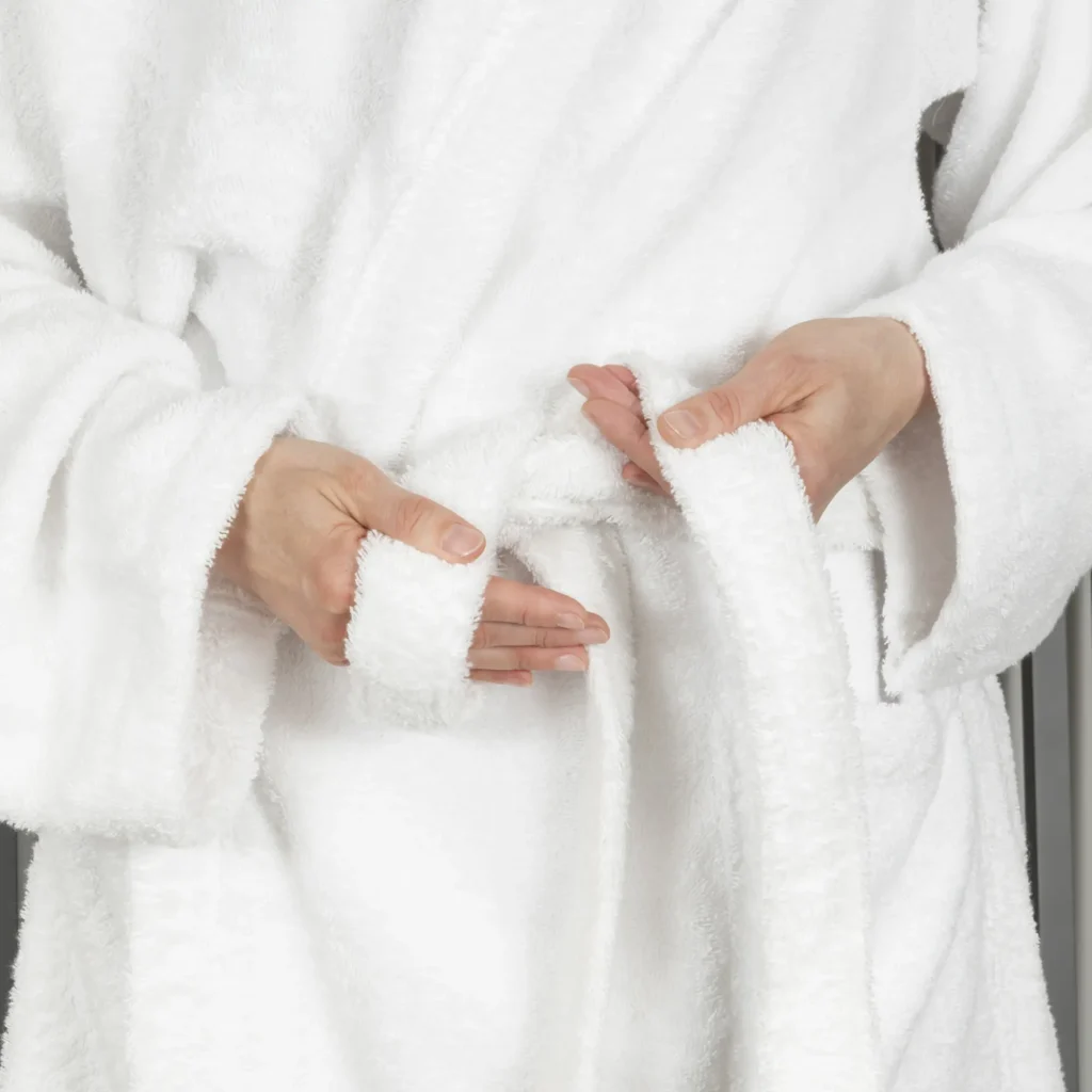 - Disponibile con cappuccio o con scialle, tasche frontali e cintura inclusa