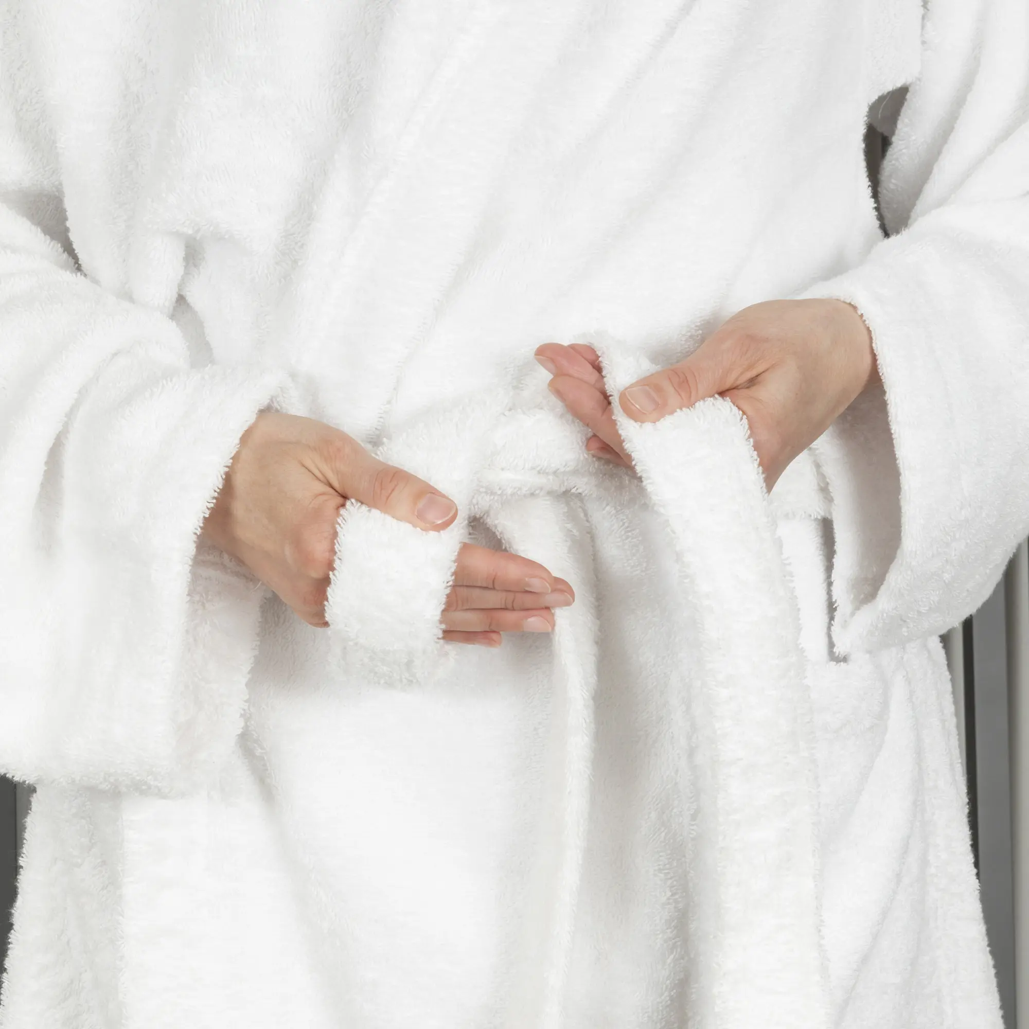 Accappatoi Oslo in spugna bianca, disponibili con cappuccio o con scialle, morbidi, resistenti e unisex.