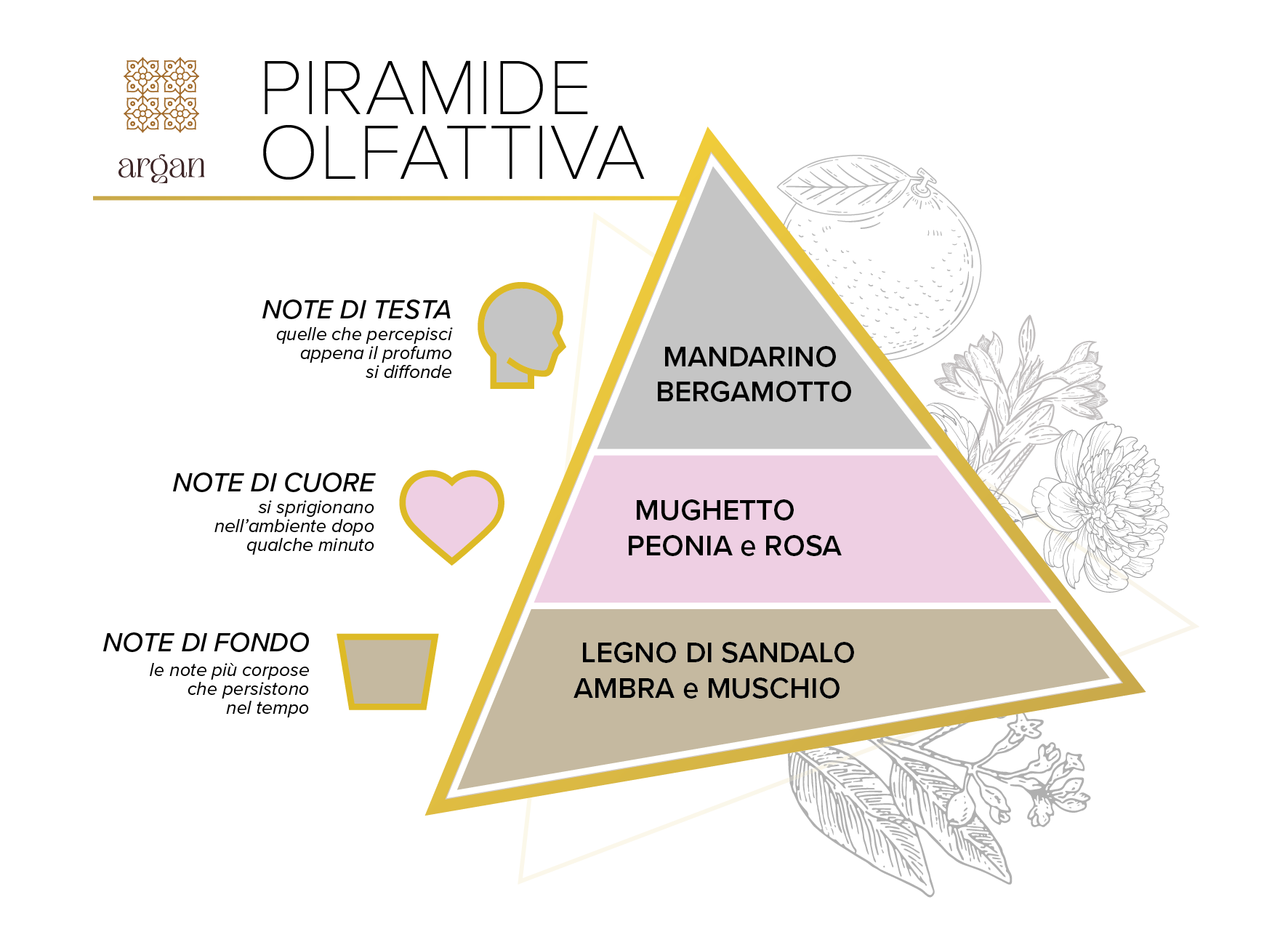 La linea cortesia Argan racchiude prodotti caratterizzati da una fragranza raffinata ed esotica, con un tocco di fascino e mistero che rimanda a luoghi lontani. Realizzata con olio di argan biologico, conosciuto per le proprietà antiossidanti, emollienti e idratanti, è un vero e proprio nutrimento e benessere per la pelle. La fragranza racchiude la freschezza del bergamotto e del mandarino con la dolcezza del mughetto, peonia e rosa. Le note di fondo avvolgenti di legno di sandalo, ambra e muschio conferiscono un tocco di mistero e fascino alla profumazione.