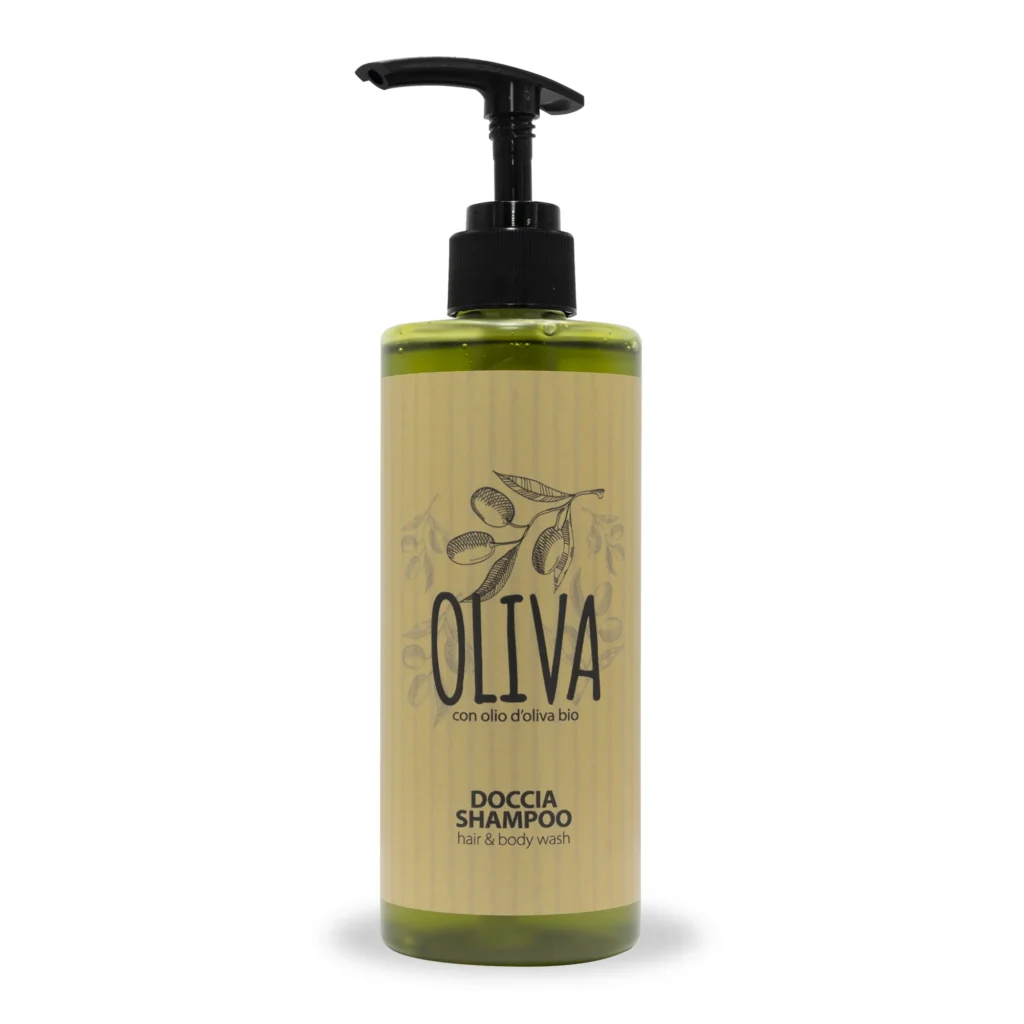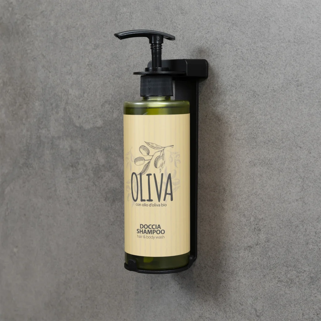 Doccia shampoo in dispenser ricaricabile da 300 ml con olio di oliva biologico. Utilizzabile con supporto a muro con sistema antimanomissione.
