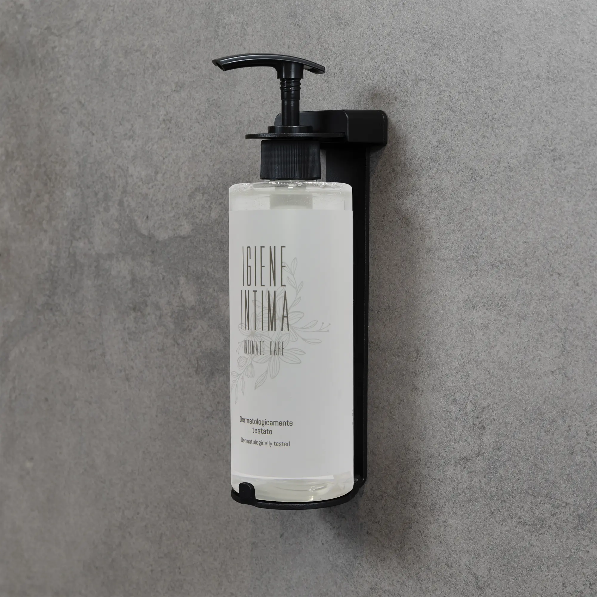 Detergente intimo in dispenser da 300 ml. Da abbinare a supporto a muro con sistema antimanomissione.