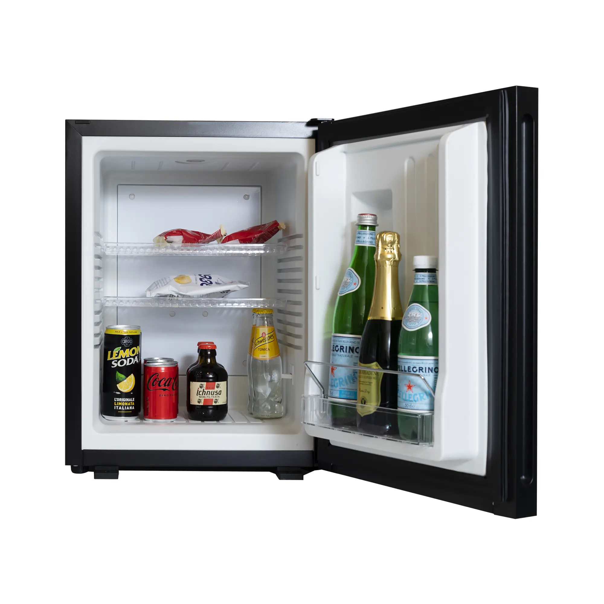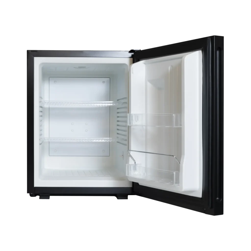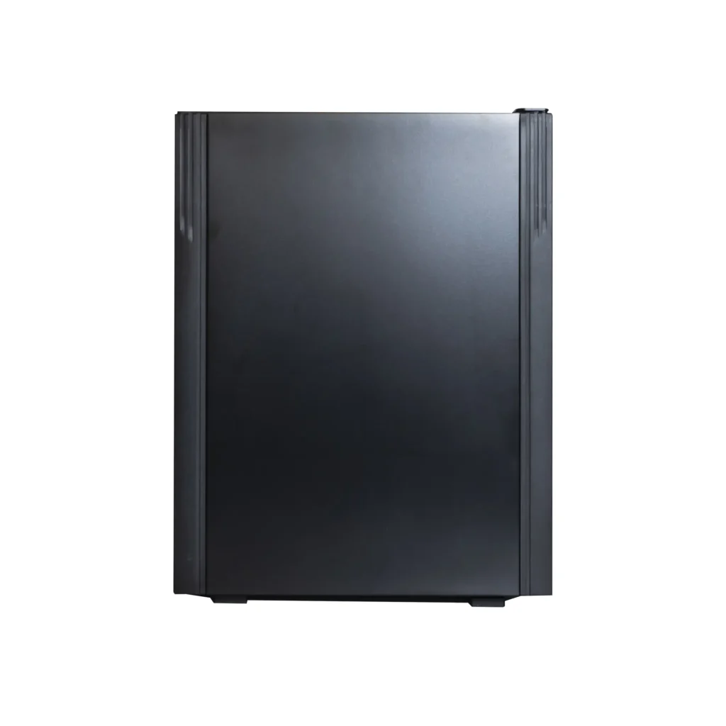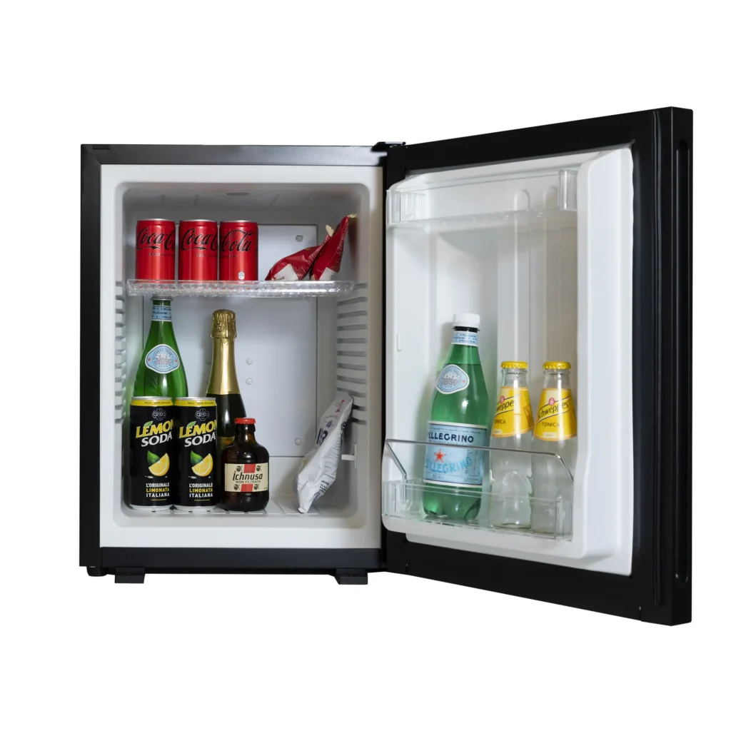 Frigobar compatto e silenzioso con porta reversibile pannellata nera, ideale per camere d’hotel e strutture ricettive.