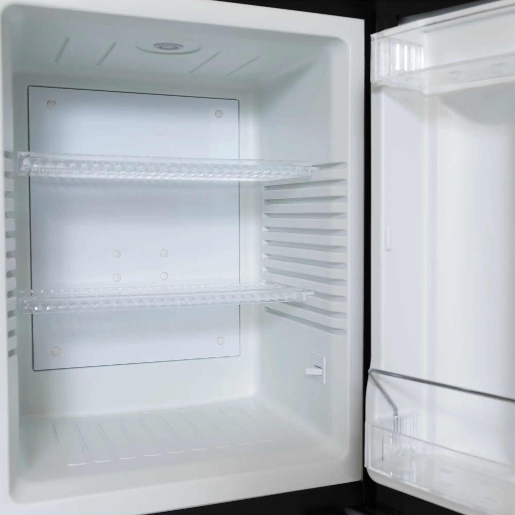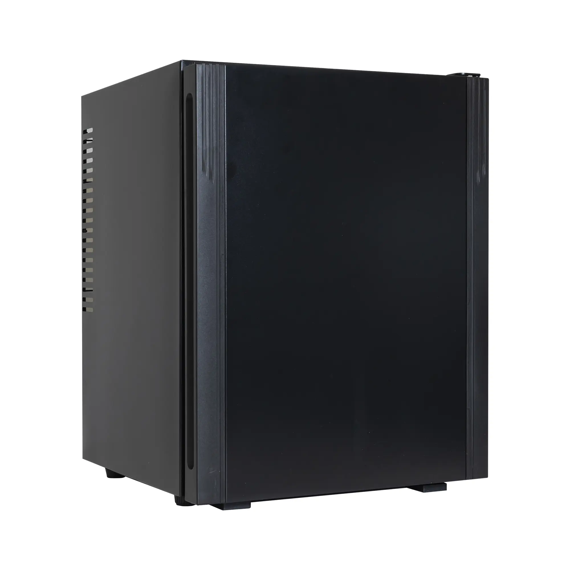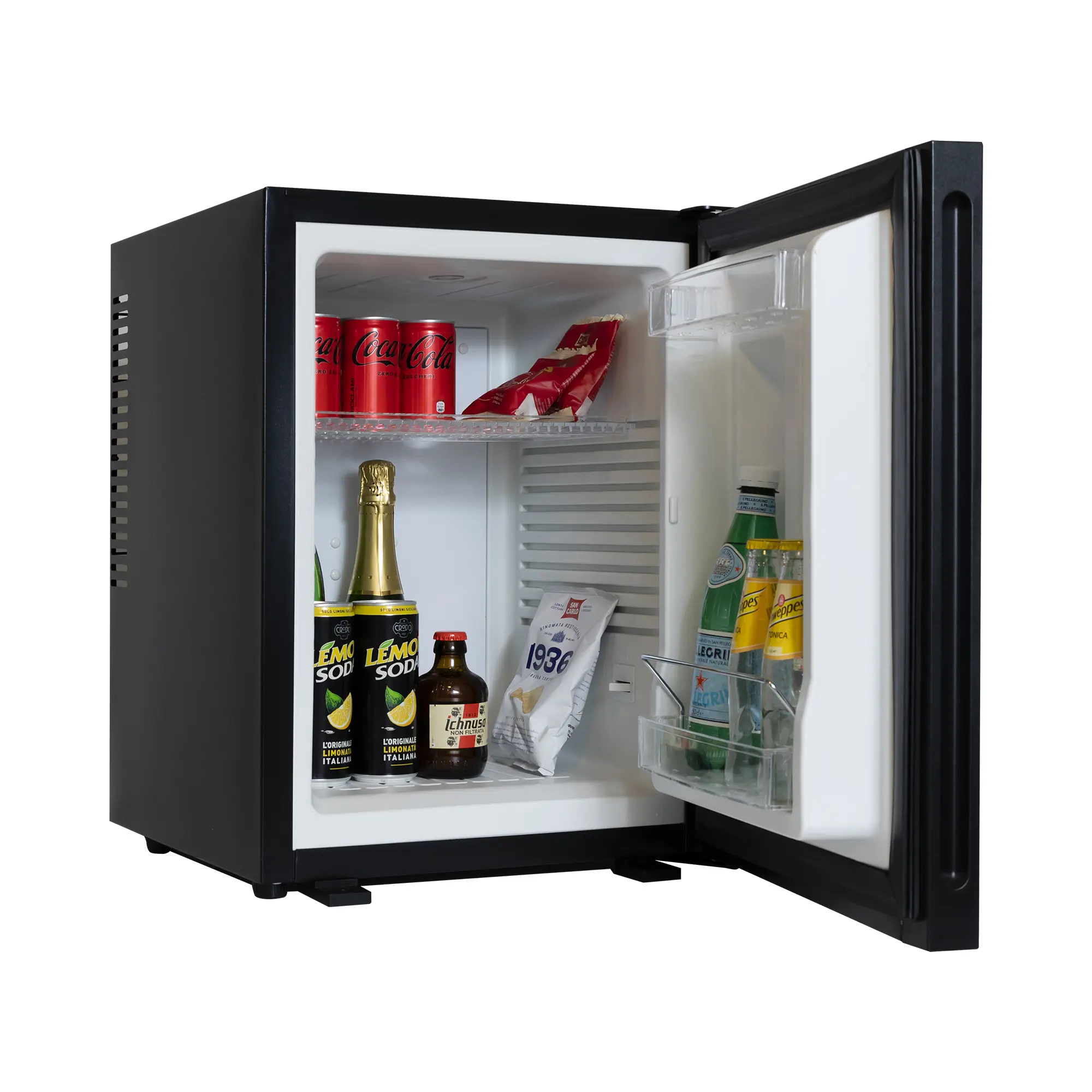 Frigobar compatto e silenzioso con porta reversibile pannellata nera, ideale per camere d’hotel e strutture ricettive.