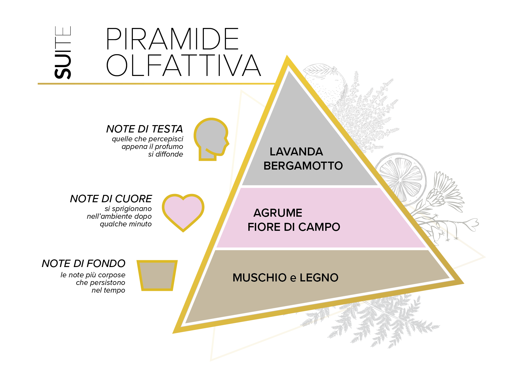 La linea cortesia Suite è caratterizzata da un design semplice ed essenziale. La sua formulazione è arricchita con proteine del grano, che donano grande nutrimento alla pelle e lucentezza ai capelli. Una linea dalla fragranza classica e intramontabile che soddisfa anche gli ospiti più esigenti. La profumazione è discreta ed elegante, dal cuore floreale di lavanda e bergamotto che rivitalizza il classico muschio con una nota dolce di agrumi e fiori di campo.