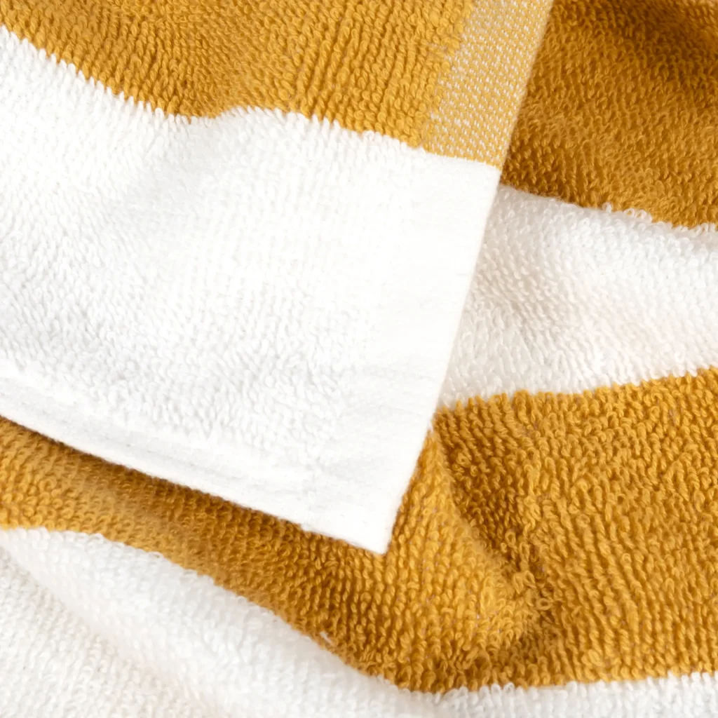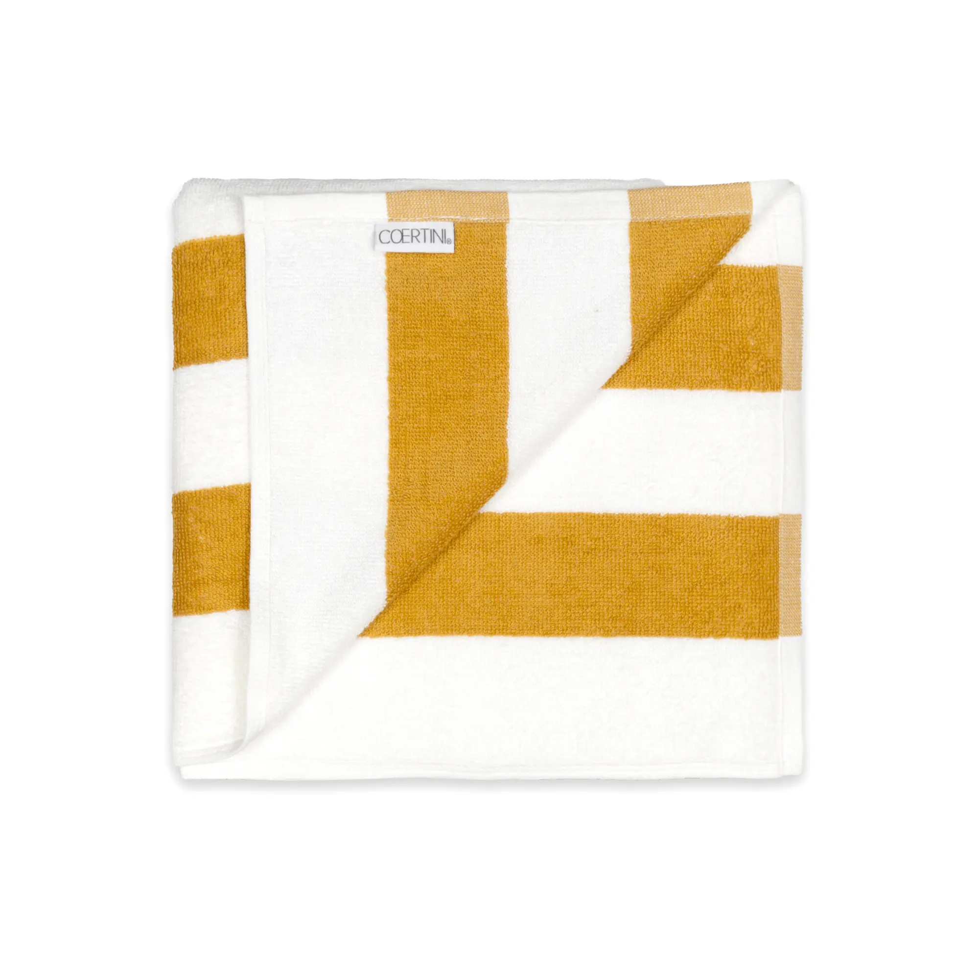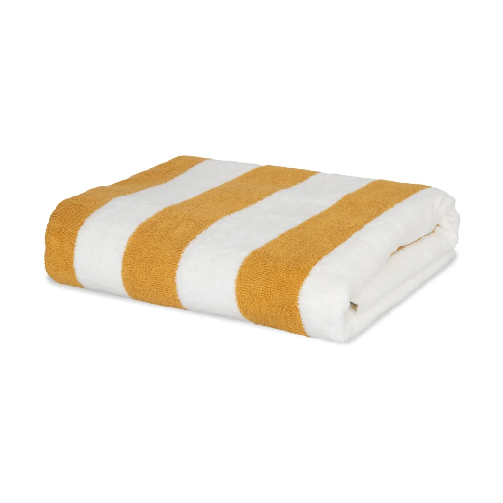 Teli mare in morbida spugna 100% cotone, con design rigato moderno, disponibili in 3 colori e personalizzabili con ricamo. Certificati OEKO-TEX Standard, ideali per piscine e spiagge.